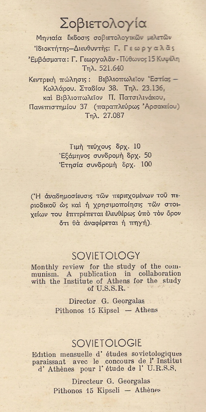 Ξεφύλλιζα σήμερα κάποια παλιά τεύχη της ‘Σοβιετολογίας‘, ενός αντικομμουνιστικού περιοδικού που εξέδιδε την δεκαετία του ’60 ο μετέπειτα χουντικός Γ. Γεωργαλάς. Κάτι που μου κίνησε το ενδιαφέρον βρισκόταν όχι το ουσιαστικό του περιεχόμενο, αλλά στο εσώφυλλο, εκεί που αναγράφονται τα στοιχεία έκδοσης. Αντί του γνωστού “Απαγορεύεται η αναδημοσίευσις….” κλπ, γράφει το παρακάτω: